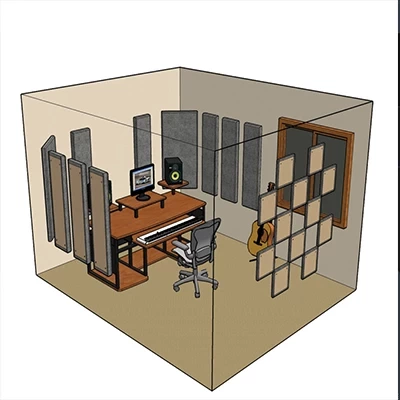 اکوستیک اتاق را با قرار دادن پنلهای اکوستیک بر روی دیوارها و دقیقاً در مقابل بلندگوها شروع کنید. معمولا دیوارها و زوایایی که در مقابل بلندگوها قرار دارند، بیشتر تمایل دارند که صدا را منعکس کنند. از دیفیوزرها هم برای پشت اسپیکرمانیتورینگها استفاده کنید تا امواج صوتی را پراکنده کرده و بازتابهای ناخواسته را به حداقل برسانید.