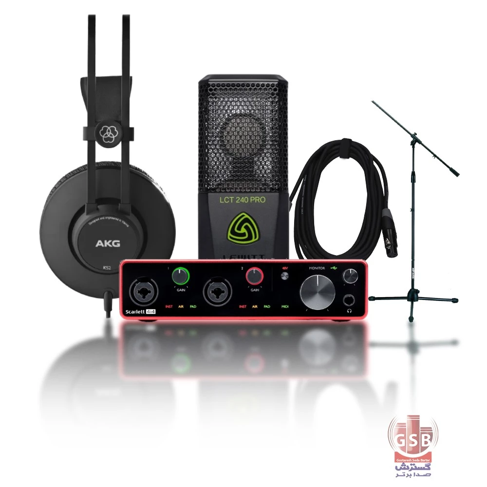 بعد از تهیه یک کامپیوتر و یک محیط اکوستیکی میتوانید کار ضبط را شروع کنید. میکروفن این پک از کمپانی حرفه ای لوویت سری LCT240 میباشد ، کارت صدا قدرتمند فوکوسرایت سری 4i4 و هدفن مانیتورینک AKG k52 از دیگر کالاهای این پک هستند.برای راحتی خریدار گرامی و کامل بودن این پک پایه استاندارد و کابل بدون نویز میکروفن دیده شده است.